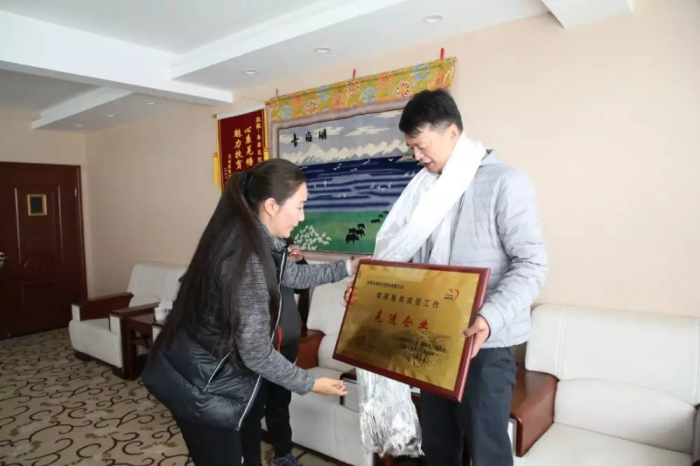 随后,才旦卓嘎向阜康医疗股份有限公司党委书记、董事长王斌颁发"脱贫攻坚工作先进企业”匾牌。