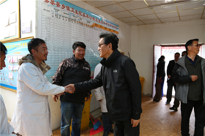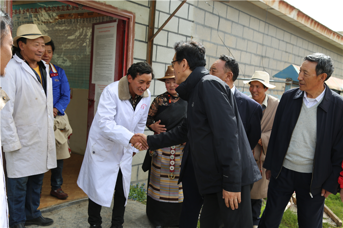 2018年了8月9日,受阜康邀请,西藏自治区政协副主席、区工商联主席、区总商会会长阿沛·晋源,拉萨大昭寺管家洛桑,西藏自治区社会科学院原处长次旺仁青,西藏阜康医疗股份有限公司党委书记、董事长王斌,西藏阜康医疗股份有限公司党委副书记、副总经理陈彬,西藏阜康医院名誉院长嘎布,阜康生殖医学中心实验室主任刘锋,阜康体检中心主检师琼玛,阿沛·晋源主席秘书旦增一行早上8点从拉萨出发,一路颠簸驰骋于下午2点50分许抵达那曲地区嘉黎县夏玛乡。听说晋源主席要来视察卫生院的建设工作,嘉黎县县长吾金不顾受伤的左腿带领当地干部群众早早等候在夏玛乡卫生院建设现场。