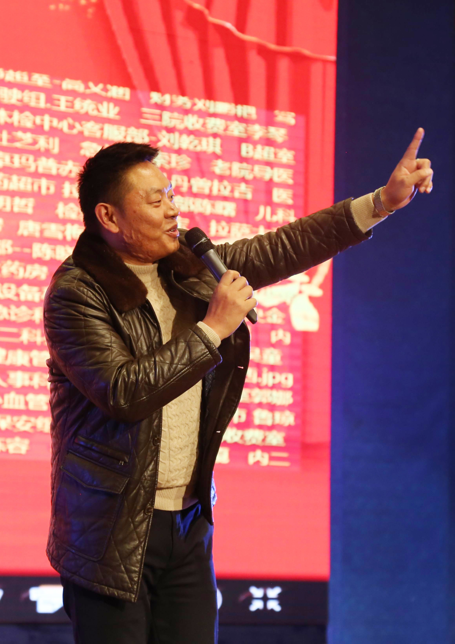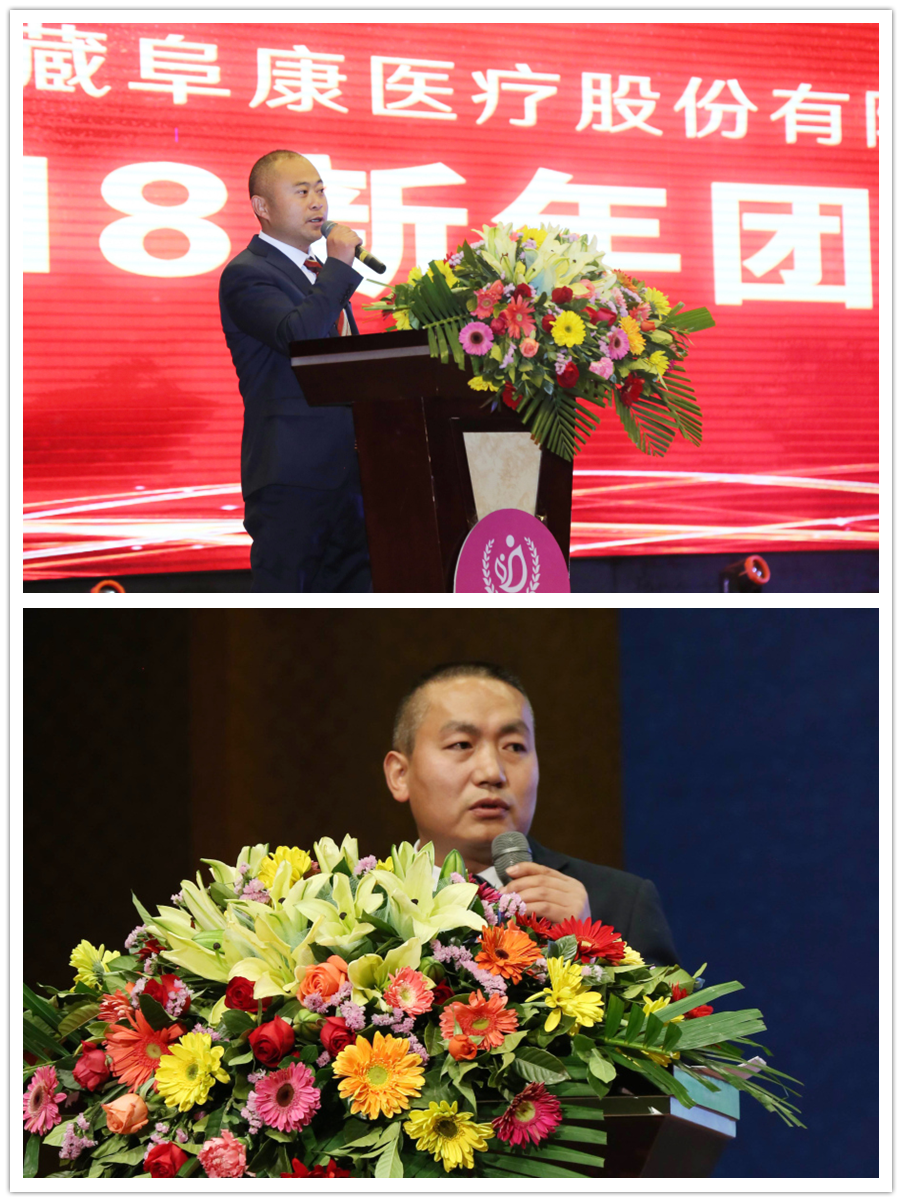 随后,董事长王斌走上讲台饱含激情地说"我之存在,因为有你”,并向所有来宾鞠躬致谢。董事长王斌讲述了阜康发展史、阜康人的奋斗史,从2005年的47名员工到现在的1024名员工,并再次感谢一路伴随阜康成长的所有人,还指出2018年是阜康发展史上很关键的一年,要早计划、早安排、早部署,要以十九大精神为指导,坚持科学发展观,早日把阜康建设成为现代化医院。