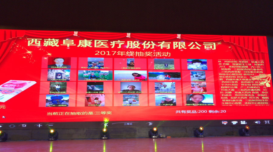 2018年1月10日,西藏阜康医疗股份有限公司新年团拜会在拉萨洲际酒店举行,下午四点来自西藏阜康医院、妇产儿童分院、心脑血管分院、健康体检中心、阜康大药房、超市的员工陆续来到会场。下午五点,主持人刘连福院长宣布会议正式开始,场内音乐响起,董事长王斌带领医院领导和特邀嘉宾入场,会场立刻响起雷鸣般的掌声和欢呼声。