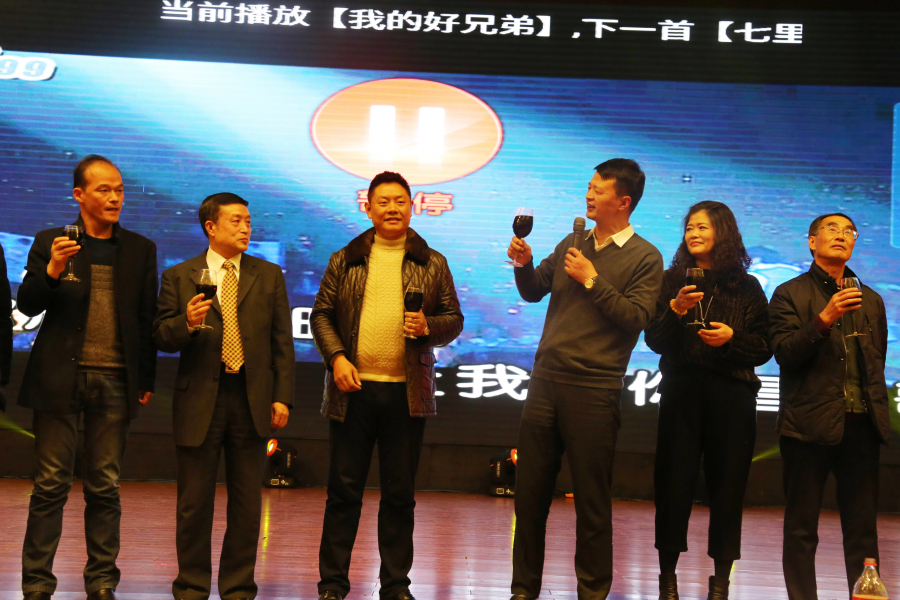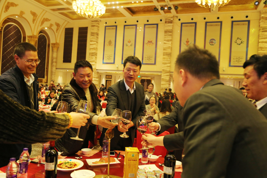 晚宴尾声,董事长王斌邀请所有院级领导上台共同举杯说:"希望大家在新的一年继续沿着创新的道路团结一致、规范管理、用心服务,开源节流地做好自己本职和医院的工作。我相信,在各位阜康同仁的共同努力下,2018年我们一定会保质、保量完成工作计划。为保障西藏自治区广大人民群众的身体健康做出新的更大的贡献,促进医院健康、持续、稳步地向前发展,更上一层楼,再铸新辉煌! ”