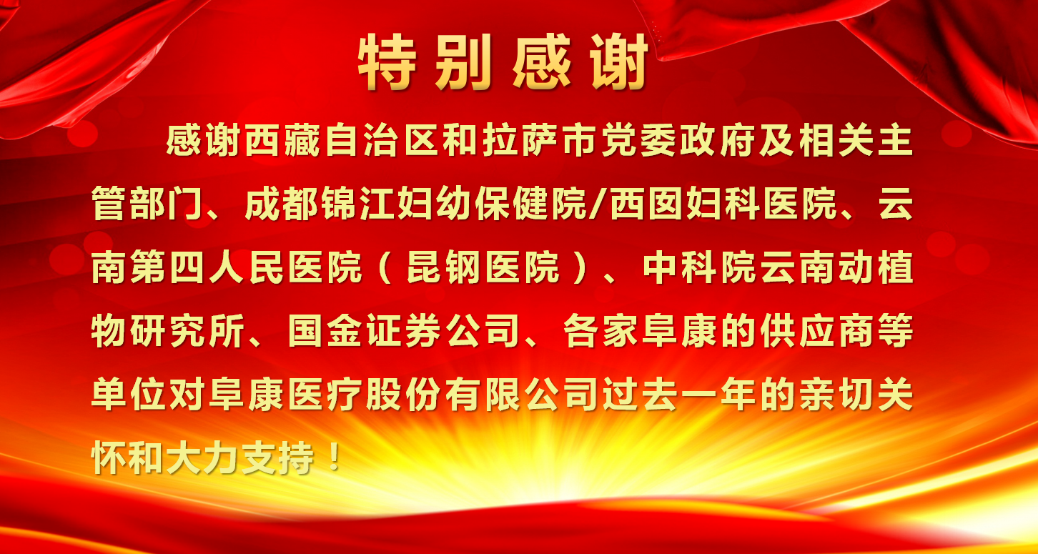 我之存在,因为有你;百年阜康,感恩有您。感恩是一种态度、一种美德、一种情怀!不忘初心、砥砺前行,感谢你们的一路陪伴,阜康的辉煌离不开每一位阜康人的奉献,雄关漫道真如铁,而今迈步重头越!2018年将是阜康腾飞的一年,在各级领导关心下,各位同仁支持下,阜康一年更比一年好!以十九大精神为指导,努力打造"团结、创新、规范、节约、用心”五位一体的现代化医院!为西藏人民群众解决看病远、看病难、看病贵的问题,全心全意为西藏人民健康服务!