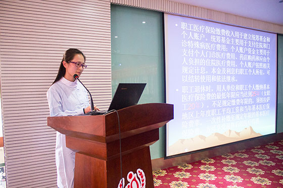 在随后的医保知识培训中,医保办张燕平同志为新入职的临床工作人员仔细讲解了包括基本医疗保险、门诊特殊病、大额医疗费商业补充保险、拉萨市医疗救助"一站式”即时结算服务、新农合等有关医保方面的专业知识,以方便临床医务工作者在以后的各项实际工作中能与医保进行很好的衔接,从而提高医院医保基金安全使用率,遏制医疗费用的不合理增长,维护参保人员的合法权益,促进各项医疗保险制度更加稳妥、有序地发展。