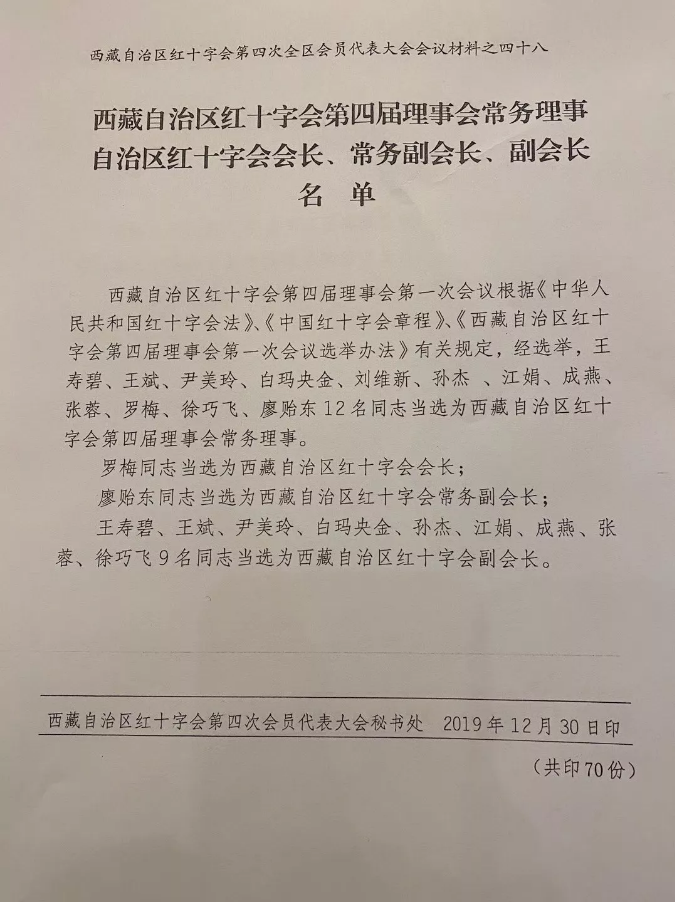 大会通过选举产生了西藏自治区红十字会第四届理事会常务理事、自治区红十字会会长、常务副会长、副会长。西藏阜康医疗股份有限公司党委书记、董事长王斌当选为西藏自治区红十字会副会长、第四届理事会常务理事。
