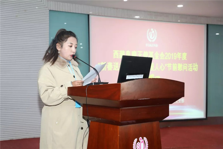 西藏阜康天使基金会秘书长吉拉带来了阜康天使基金会创始人王斌、刘潇潇对困难员工的祝福和慰问,勉励大家努力工作,与阜康共同进步,在走向幸福的路上一个都不能少,并祝大家过一个幸福快乐年!由于此次受助人员都是藏族员工,吉拉秘书长用藏语鼓励大家积极生活、努力工作,要用一颗感恩的心回报社会。阜康天使基金会将在区党委、政府的领导下,紧跟时代步伐,发展创新,争取在助医、助学、助困上帮助到更多的人。