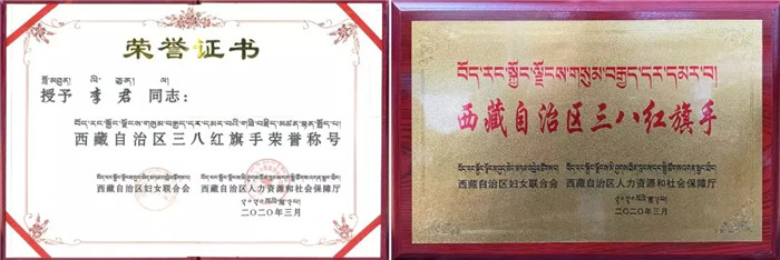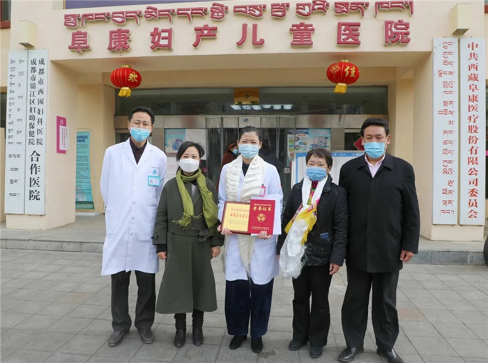 2020年3月6日,西藏自治区妇女联合会书记周世英、西藏自治区人力资源和社会保障厅巡视员刘莉来到了西藏阜康医院妇产儿童院区,为李君院长带来了全区妇女界的最高荣誉——西藏自治区三八红旗手。西藏阜康医院总院长宁晓、西藏阜康医疗股份有限公司高级顾问欧珠罗布参加了表彰仪式。