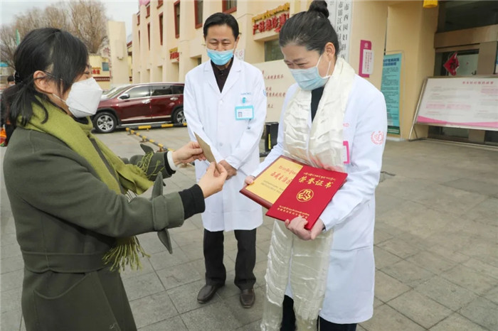 由于目前处于新冠肺炎疫情期间,两位领导亲自将此次荣誉送到阜康,虽然表彰仪式简单,但却意义非凡。西藏自治区人力资源和社会保障厅巡视员刘莉为李君院长献上了洁白的哈达和"西藏自治区三八红旗手”荣誉证书及奖牌,并勉励道: