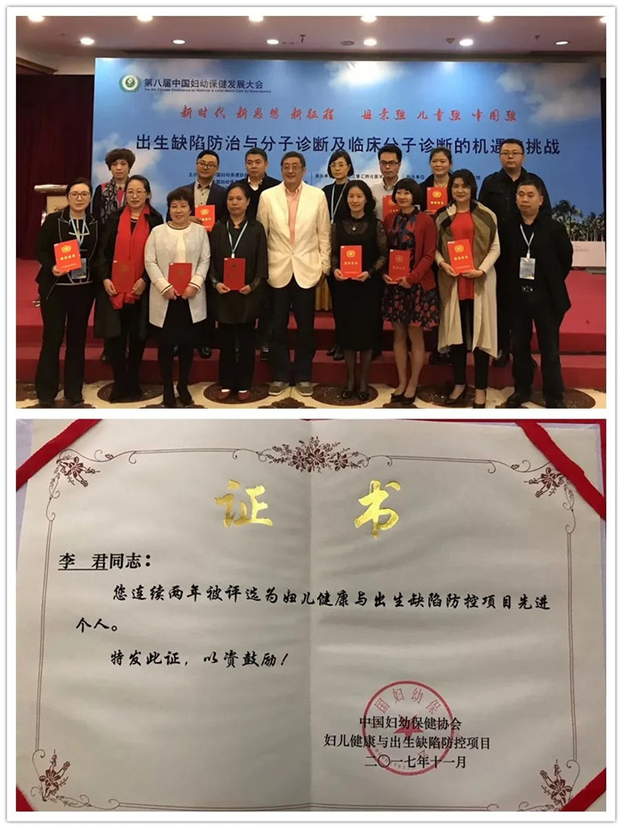 在院期间,李君主动承担了学术兼职的重担。在2014年荣获"西藏自治区卫生行业妇女岗位建功先进个人”称号,在2016年、2017年、2018年连续三年间被评为"妇儿健康与出生缺陷防控项目先进个人”。