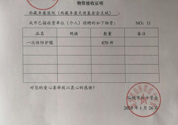 日前,湖北省仙桃市红十字会向西藏阜康医疗股份有限公司寄来一份荣誉证书,感谢西藏阜康医疗在全市抗击新冠肺炎行动中发扬"人道、博爱、奉献”的精神,积极向仙桃市捐款十万元支持该市"抗疫”工作。