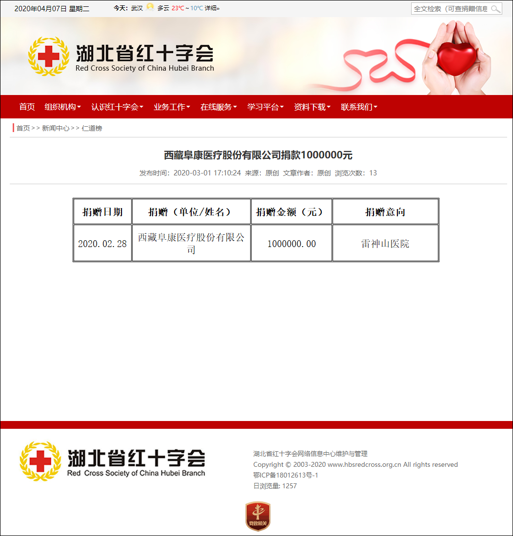 据了解,新冠肺炎疫情在湖北爆发以来,西藏阜康医疗迅速行动,在配合自治区党委、政府和卫生行政主管部门做好本地防疫工作的同时,通过各种方式向湖北疫区捐款捐物,全力支持湖北全省的抗疫工作。