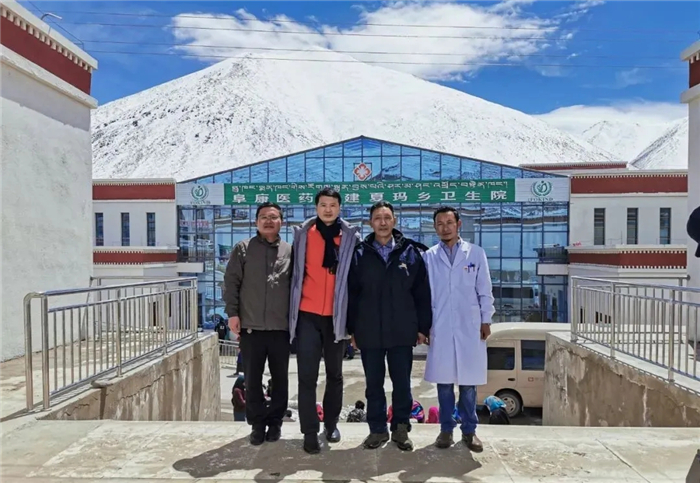 左起:夏玛乡乡长李智安,阜康医院王斌董事长,阜康医院名誉院长嘎布,乡卫生院院长东知尘措合影