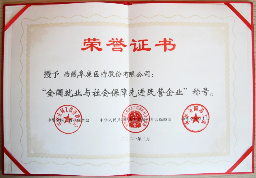 近日,中华全国工商业联合会、中华人民共和国人力资源和社会保障部、中华全国总工会联合表彰一批全国就业与社会保障先进民营企业,西藏阜康医疗股份有限公司榜上有名,成为西藏自治区唯一一家获此殊荣的民营企业。