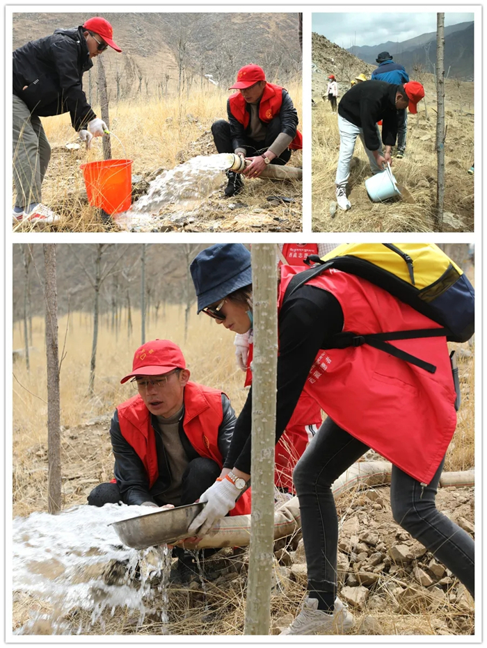 简餐过后大家再次投入劳动,树苗已然全部种植入土,最后一项工序是大水灌苗,可是水管长度有限,大多树苗不能直接浇灌,这丝毫不能难倒阜康人,大家拎着水桶,抱着水盆,拉着水管,细心浇灌每一棵树苗。