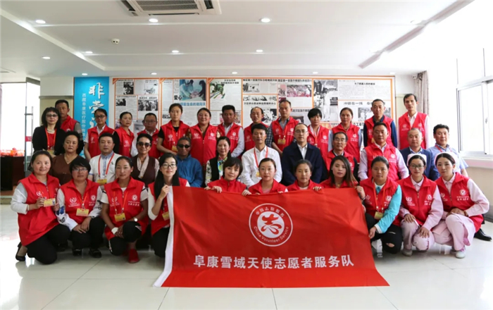 西藏阜康雪域天使志愿者服务队成立于2017年,以"奉献、友爱、互助、进步”为宗旨,在患者就诊秩序维护、敬老助残、医疗解答、保护环境、社区义诊、健康讲座、送医送药下乡等领域开展了多种形式的志愿活动。