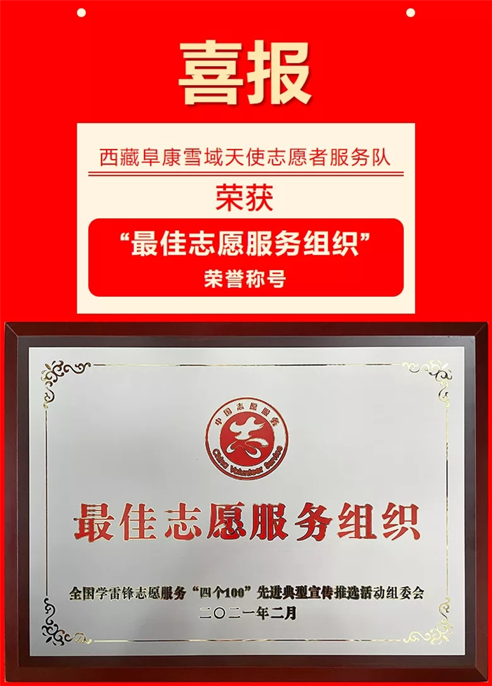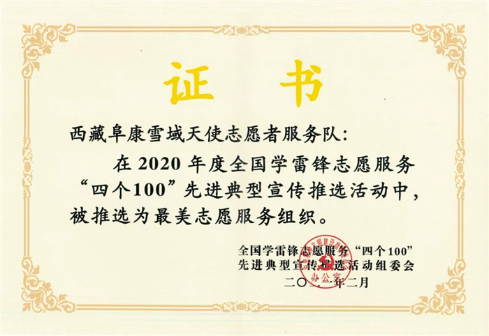 在2020年度全国学雷锋志愿服务"四个100”先进典型宣传推选活动中,西藏阜康雪域天使志愿者服务队荣获"最佳志愿服务组织”荣誉称号。