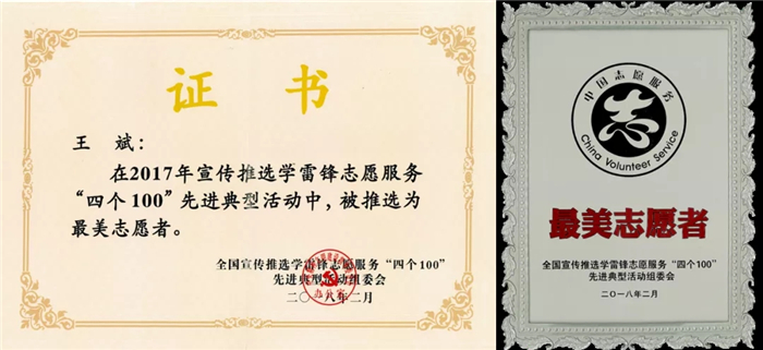 西藏阜康雪域天使志愿者服务队队长王斌,在2017年学雷锋志愿服务"四个100”先进典型活动中,被推选为最美志愿者。