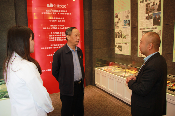 在阜康医院五楼院史馆,刘连福向刘家杰一行介绍了阜康医疗不平凡的发展历程以及阜康人在党的建设、抗震救灾、公益事业、企业文化等方面的成就,刘家杰一行对阜康医疗各方面的工作表示充分认可并对"阜康”中所含的物阜民康——"物产丰富,民族安康”之意表现出极大的兴趣,希望通过阜康人在医药领域的不懈努力,勇于攀登医学高峰,为西藏的医疗发展贡献力量。